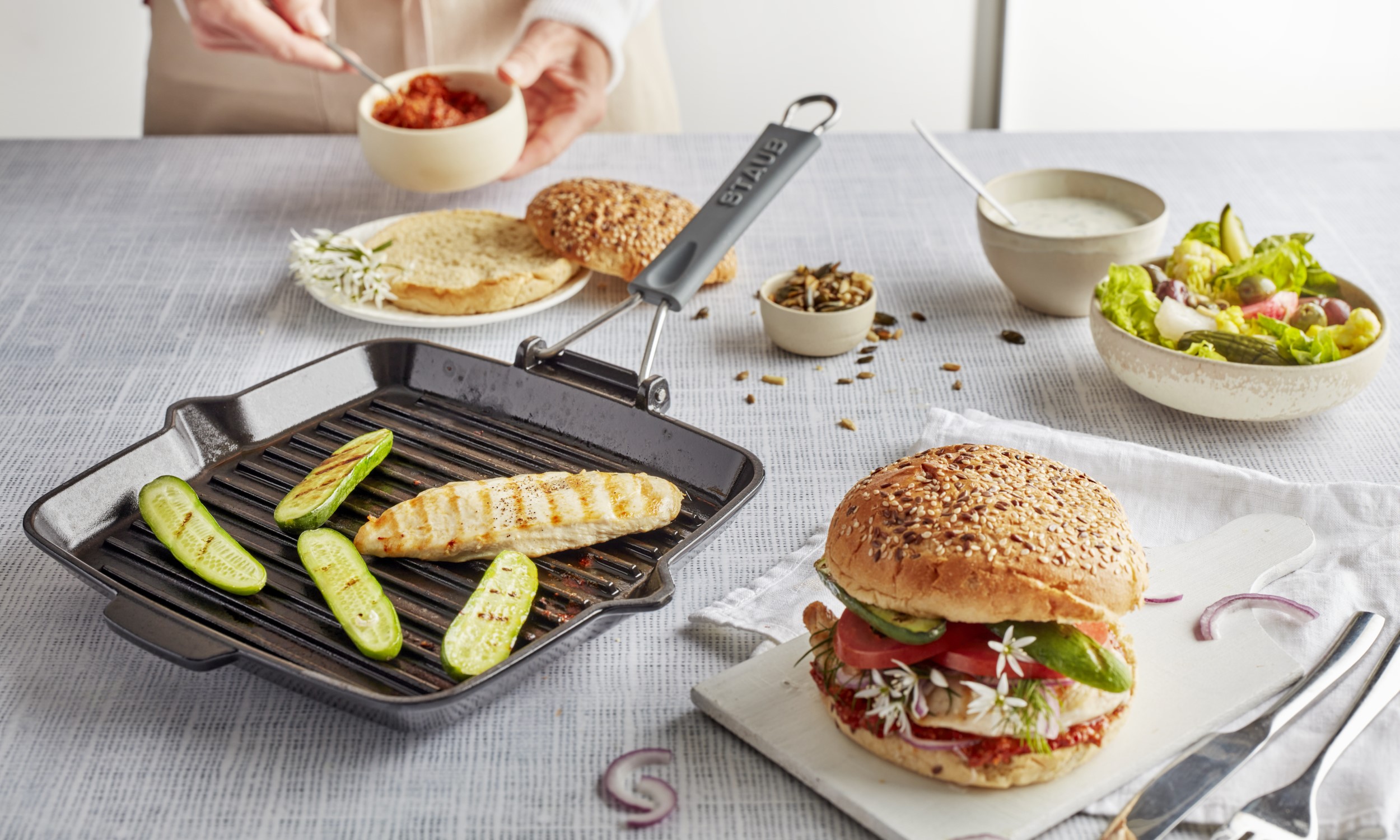 - Besmeer het onderste broodje met een beetje saus en leg hier de burger en kaas op. Leg de schijfjes komkommer, rode ui en gegrilde bloemkool hierop. Serveer met een slaatje.