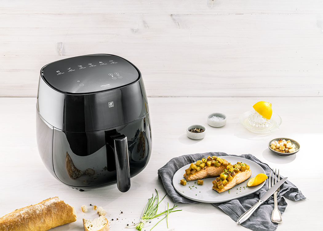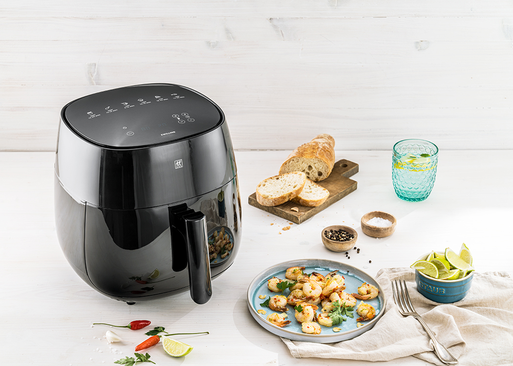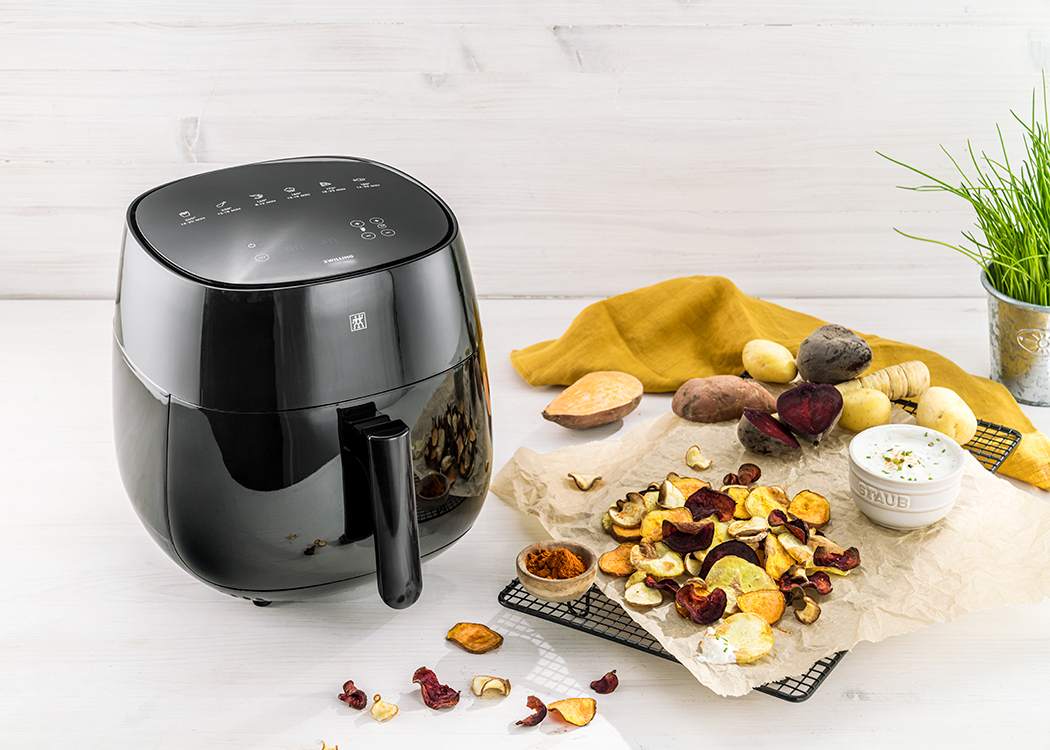 2. Meng de frietjes grondig met olie, zout en paprikapoeder en verdeel gelijkmatig over het rooster van de ZWILLING airfryer. Bak ze ongeveer 15-18 minuten in het frietprogramma (200°C), afhankelijk van hoe bruin je ze wilt hebben. Draai de frietjes halverwege de tijd om door ze krachtig te schudden.