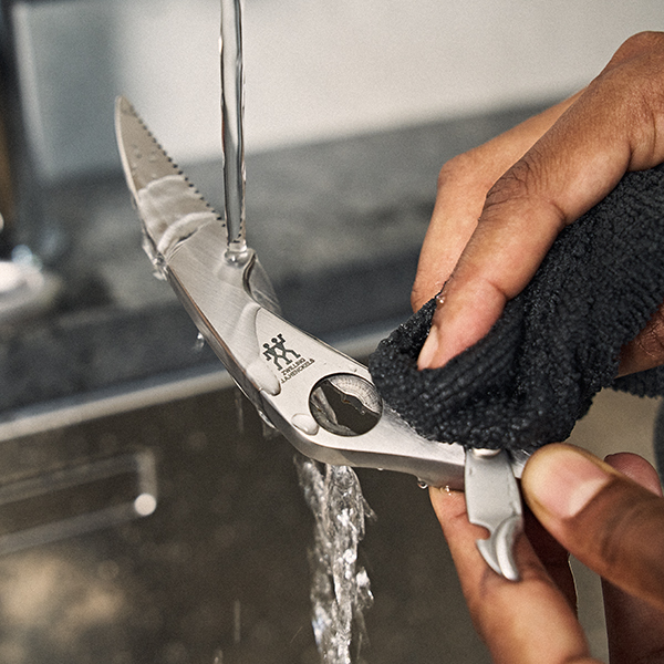 Die ZWILLING Scherenserie TWIN SELECT lässt sich einfach unter warmem Wasser abspülen und mit einem Geschirrtuch trocknen, um sie sauber und einsatzbereit zu halten.