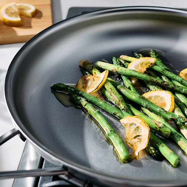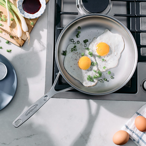 Industry 5 Nanotouch is crafted of pure stainless steel, combining a meticulous bead-blasting technique with our patented Silvinox® Treatment to create a microscopic texture that delivers the versatility and supreme searing power of stainless steel, with quick and easy release for an effortless cooking experience.