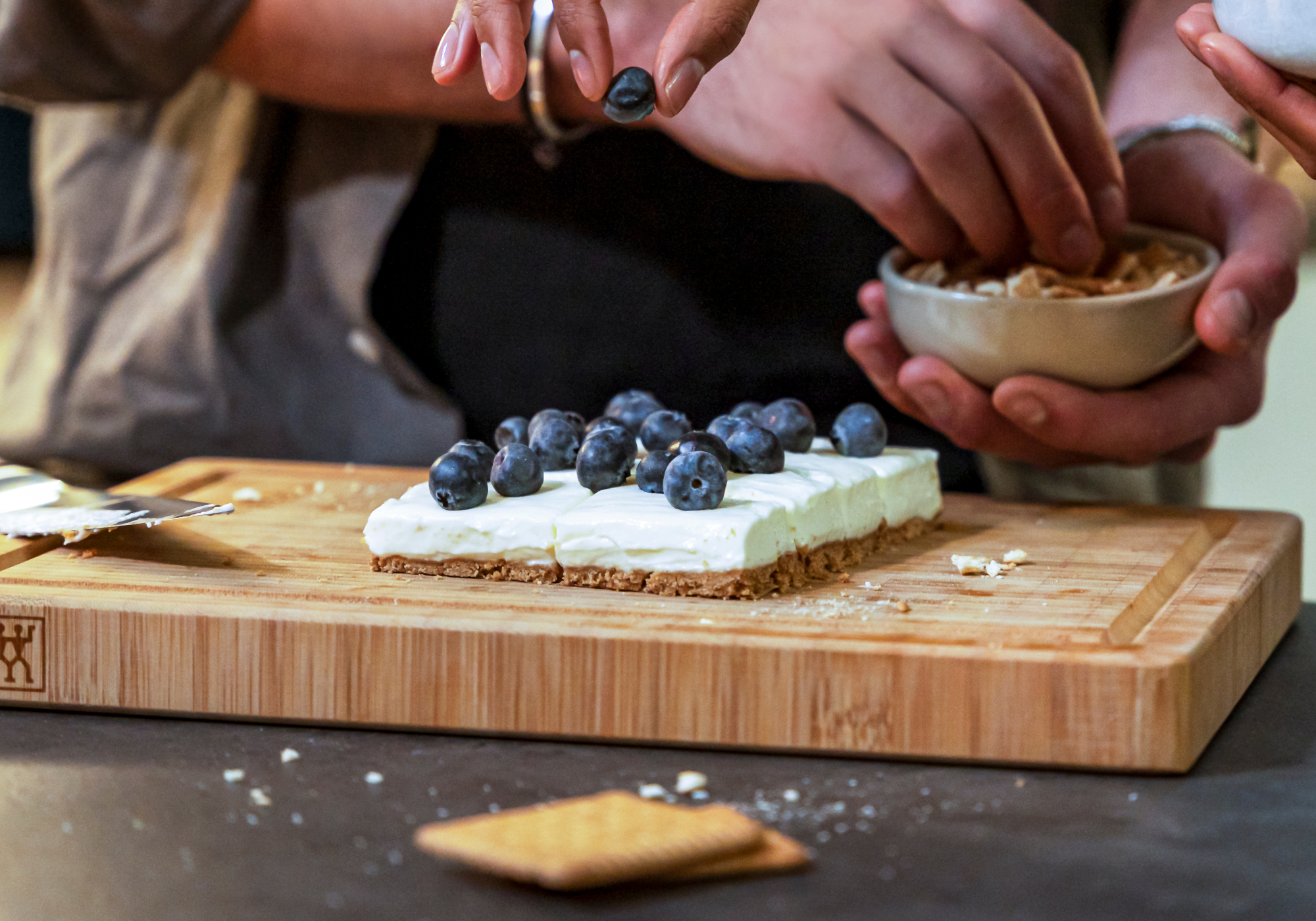 Add the vegetables to the dish. Cut the feta into approx. 1 cm cubes and fold into the vegetable mixture.