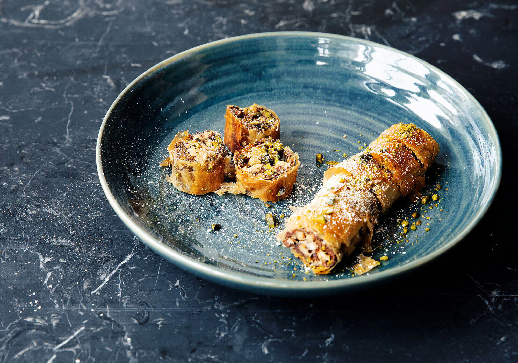- Before serving, remove milk puddings from the fridge. Pour pomegranate syrup on top and sprinkle with ground cardamom, chopped pistachios, and edible rosebuds. Enjoy!