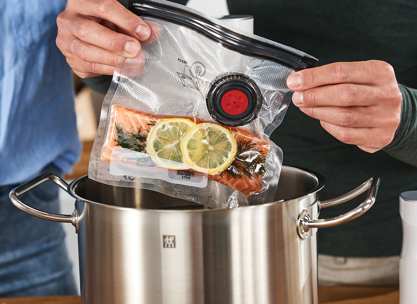 Attach the ZWILLING ENFINIGY sous-vide stick to a suitable pot, e.g. ZWILLING Pro. Fill with water, observing the maximum filling quantity on the stick, and heat the water to 85 °C. Put the bag in and cook the vegetables sous-vide for 1 hour.