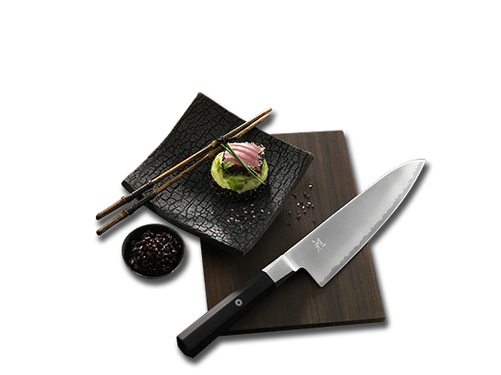 SPECIAL FORMULA STEEL MIYABI Red Morimoto Edition Special Formula Steel with a hardness of 57 Rockwell. This traditional German composition includes carbon for hardness and chromium for corrosion resistance. Perfect balance between Japanese bladesmithing and Western-style ease of use.