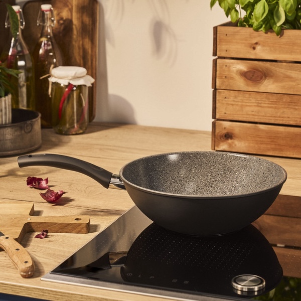 La Cucina Italiana fusioniert mit asiatischen Gerichten: Der BALLARINI Bari Wok macht’s möglich! Die CERAFORCE Keramikbeschichtung in Granitium Optik, hergestellt ohne PFAS, bietet dir exzellente Antihaft-Eigenschaften und ist bis zu dreimal langlebiger als unsere bisherigen Keramikbeschichtungen*. Dank des Radiant Induktionsbodens verteilt sich die Hitze bis zum Rand schnell und gleichmäßig, sodass deine Gerichte immer optimal gelingen. Und der THERMOPOINT Hitzeindikator hilft dir, die optimale Temperatur zu finden. Der ergonomische Stay-Cool-Griff mit Softtouch-Gummierung bleibt dagegen kühl, damit du entspannt kochen kannst.