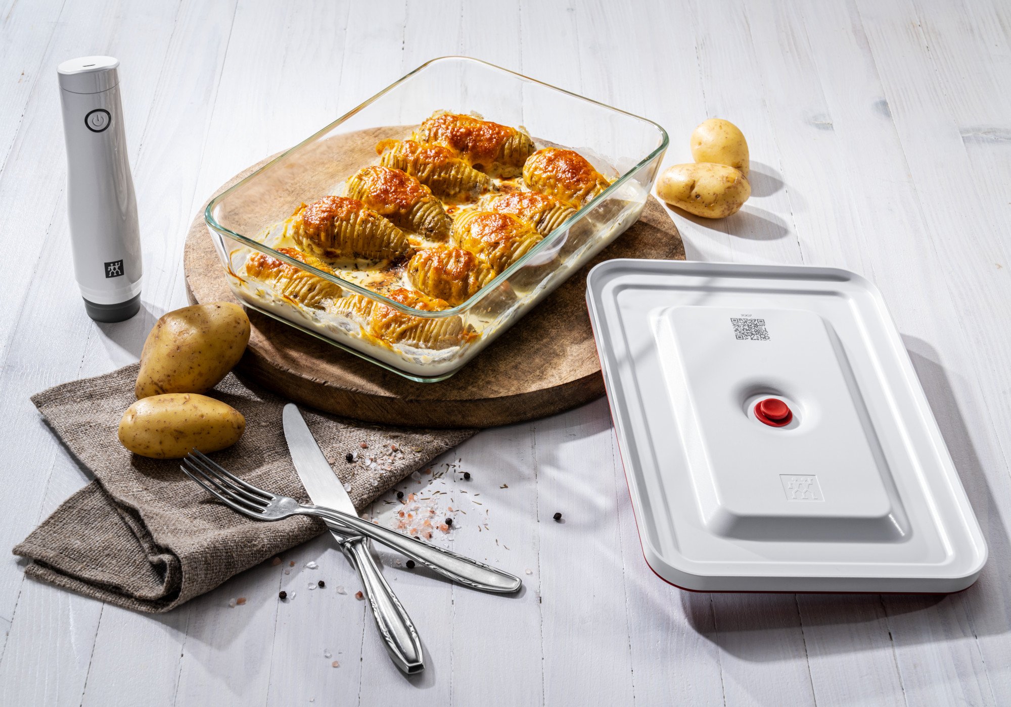 Den Boden einer ZWILLING FRESH & SAVE Auflaufform mit Olivenöl einfetten und mit etwas passierten Tomaten bedecken. Kräftig mit Salz, Pfeffer und italienischen Kräutern würzen. 10 Cannelloni darauf legen. Mit Béchamelsauce bedecken. Darauf wieder etwas passierte Tomaten mit Gewürzen, restliche Cannelloni, restliche Tomatensauce und die übrige Béchamelsauce verteilen.