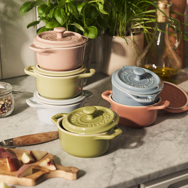 Das Set aus Mini-Cocottes in Macaron-Farben mit abdichtendem Deckel eignet sich ideal für das Zubereiten und Servieren von Ofengerichten als Einzelportionen, die an die individuellen Anforderungen und Vorlieben der Gäste angepasst werden können. Vegan, glutenfrei oder mit extra Käse: Mit den kleinen Keramiktöpfen in verschiedenen Pastelltönen bekommt jeder eine Sonderbehandlung. Das Mini-Cocotteset ist in einer attraktiven Geschenkbox verpackt und ist damit das perfekte Geschenk für den Feinschmecker in Ihrem Leben – oder für Sie selbst.
