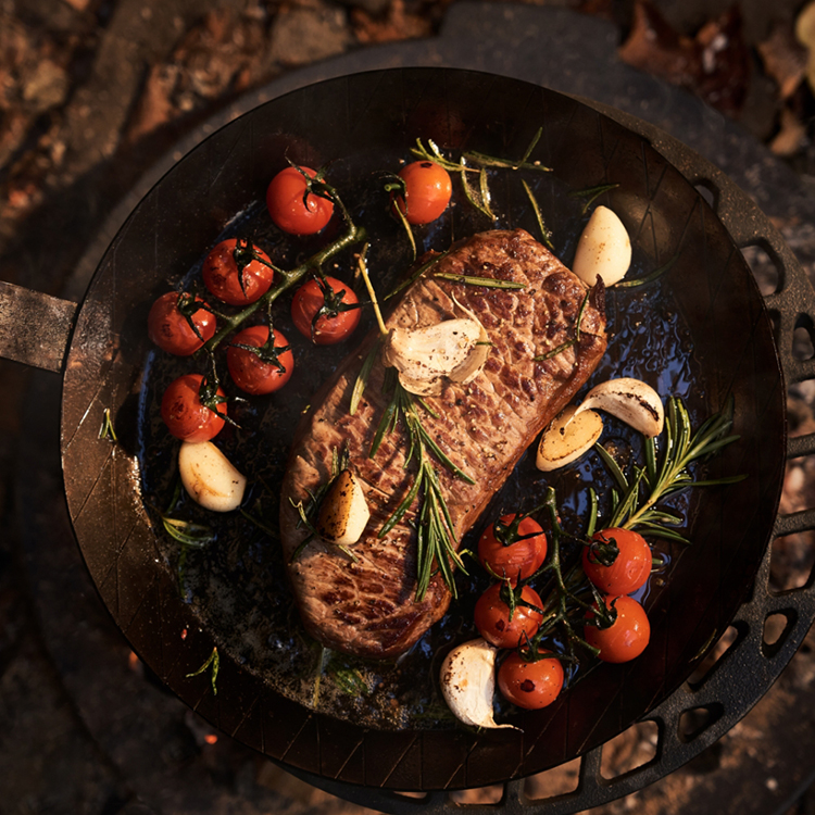 Da sie nicht beschichtet ist, eignet sich die Eisenpfanne perfekt zum scharfen Anbraten, Rösten und Grillen von Fleisch und Gemüse. Zuhause auf dem Herd und auch draußen auf dem Grill.