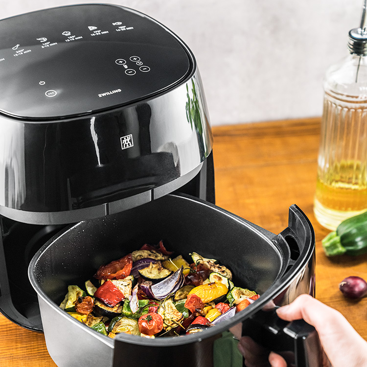 Lecker muss nicht kompliziert sein – die ZWILLING Heißluftfritteuse, auch Airfryer genannt, ist dein neues Küchengerät, um einfach Pommes, Pizza oder Chicken Wings zuzubereiten. Aber nicht nur Herzhaftes wird darin knusprig und lecker, auch Muffins und Kuchen gelingen auf Knopfdruck. Frittieren, garen oder backen – dank Heißluft in der kompakten Fritteuse schnell gemacht.