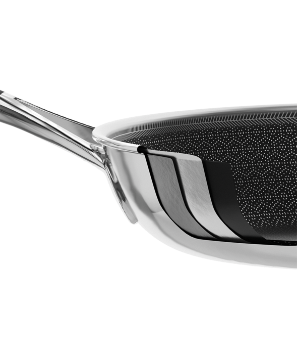 Dual Performance: Langlebiger Edelstahl mit Antihaftkomfort – die All-in-One-Pfanne für scharfes Anbraten und sanftes Garen. Geeignet für Metallutensilien.