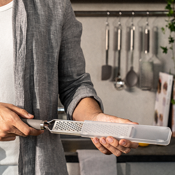 So scharf und dabei so sicher. Und gleichzeitig pflegeleicht: Du kannst die Reibe einfach in der Spülmaschine reinigen. Und zur Aufbewahrung: Einfach per Öse an die Küchenleiste hängen. Oder dank Schutzhülle sicher verpackt in die Schublade legen.