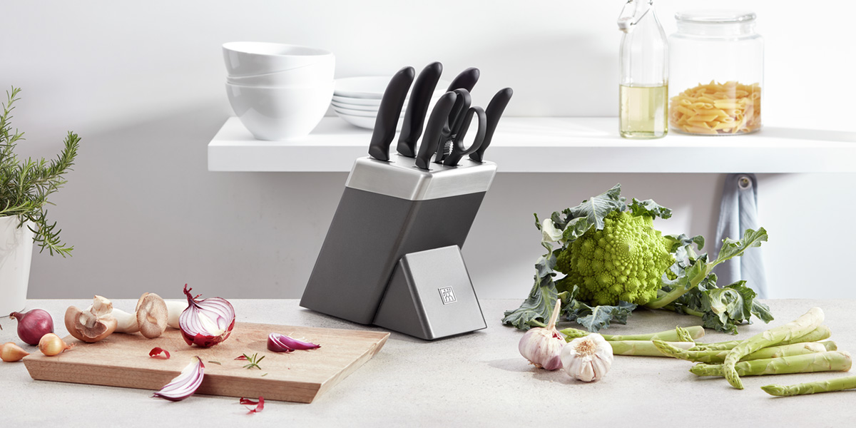 Messerblock? Oder Schleifstein? Beides! Der selbstschärfende Messerblock aus der Serie ZWILLING Style dient nicht nur der sicheren Aufbewahrung deiner Messer. Er schärft sie auch noch! In den Einsteckfächern der Messer mit glatter Klinge befinden sich Keramik-Schleifsteine. Diese sind optimal auf die passenden Messer von ZWILLING Style ausgerichtet und schleifen sie automatisch bei jedem Hineinschieben und Hinausziehen. Die fünf Messer sind aus rostfreiem Spezialstahl der ZWILLING Sonderschmelze gefertigt, einem exklusiven Stahl, der sehr robust und korrosionsbeständig ist. Dazu kommen die eisgehärteten FRIODUR Klingen, die für ein scharfes, effizientes Schneiderlebnis sorgen. Und dank der ergonomisch geformten Kunststoffgriffe liegen die Messer bei auch noch sehr angenehm in der Hand. Neben einem Spick- & Garniermesser, einem Universalmesser, einem Fleischmesser, einem Kochmesser und einem Brotmesser beinhaltet der Block noch eine ZWILLING TWIN L Vielzweckschere. Ein Alleskönner, der nicht nur in der Küche eine gute Figur abgibt.