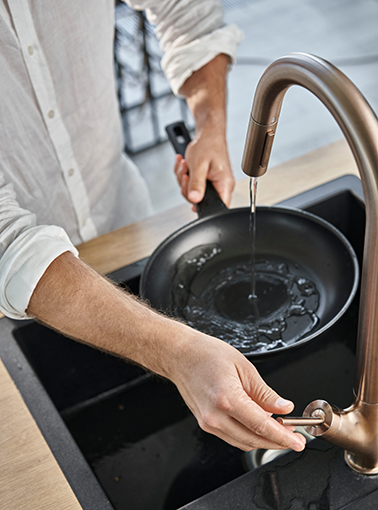 Steg mere grønt: BALLARINI Ledro-panderne er fremstillet af mere bæredygtige materialer: 100 % genanvendt aluminium i pandens kerne og 37 % biobaserede materialer i håndtaget. Plus en særligt holdbar keramisk CERAFORCE Black-belægning, der får panden til at holde længere. En symbiose af innovation og italiensk design med et sandlook for et mere bæredygtigt køkken.