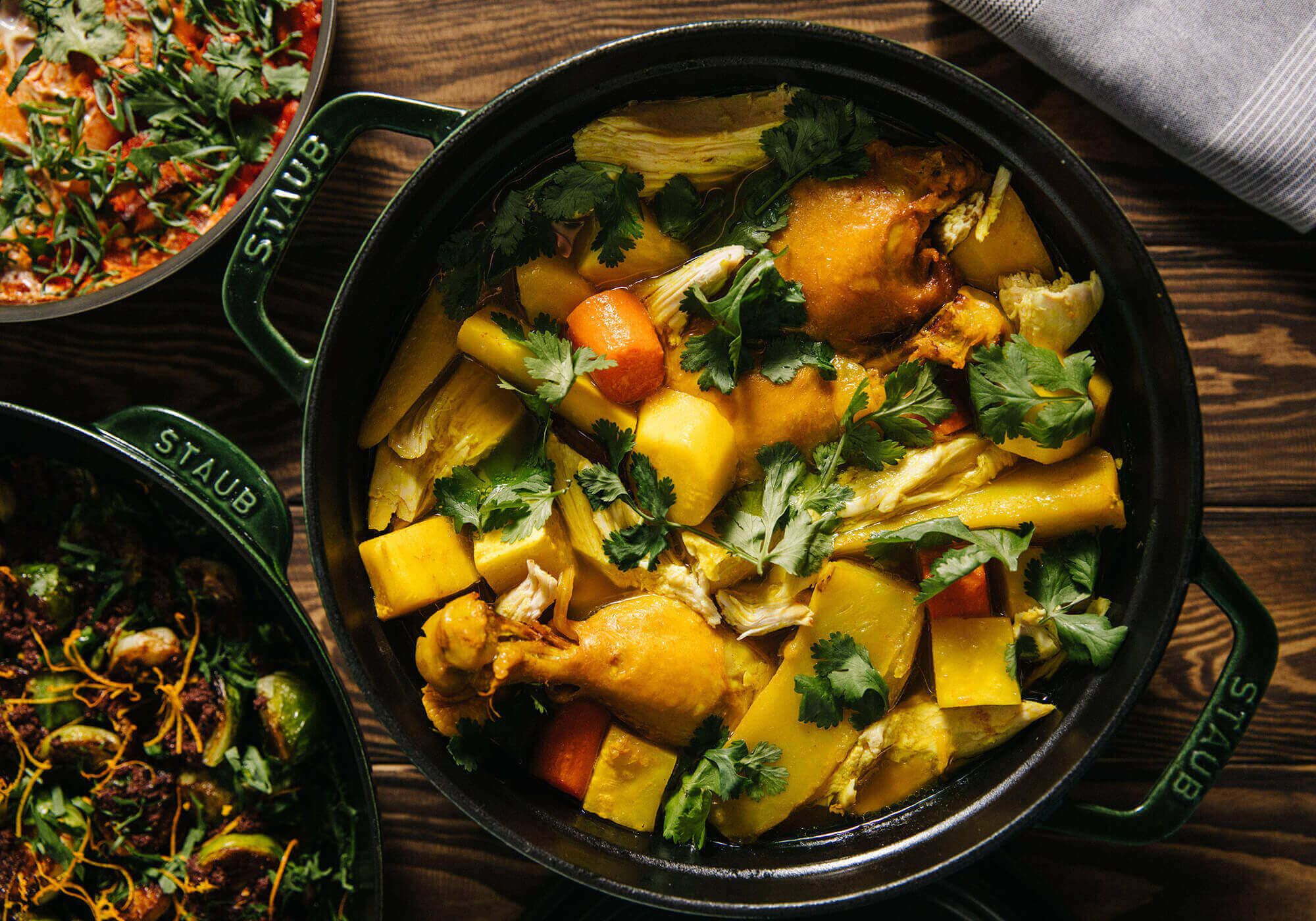 - Tilsæt vegetabilske bouillon, salt og kikærter, og lad det simre på medium-lav varme i ca. 1 time, eller indtil kikærterne er bløde. Fjern en skål kikærter og kogevæske, overfør den til en lille gryde og sæt den til side. Tøm halvdelen af kogevæsken fra den store gryde og sæt den til side.