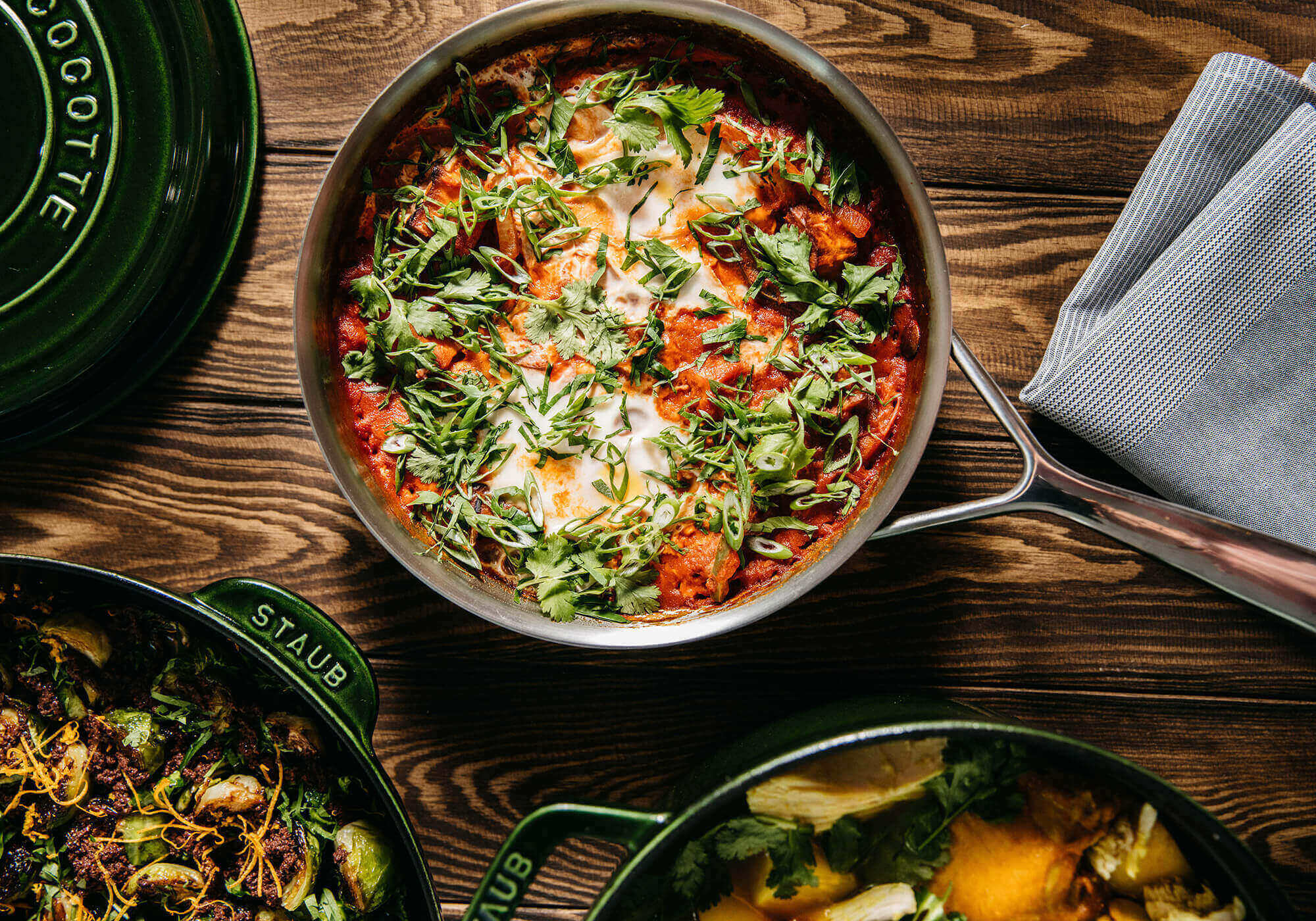 - I den lille gryde bringes det reserverede kikærte- og kogevæske i kog og tilsættes spinat. krydder med salt, peber og spisskommen. Lad det simre, indtil spinaten krøller, omrøres lejlighedsvis. Server hummus-suppe med kikær-spinat-blanding. God fornøjelse!