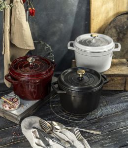 STAUB cocotten kan lukkes tæt med sit flade låg. Indvendigt sikrer den specielle dråbestruktur en effektiv væskefordeling i låget.
