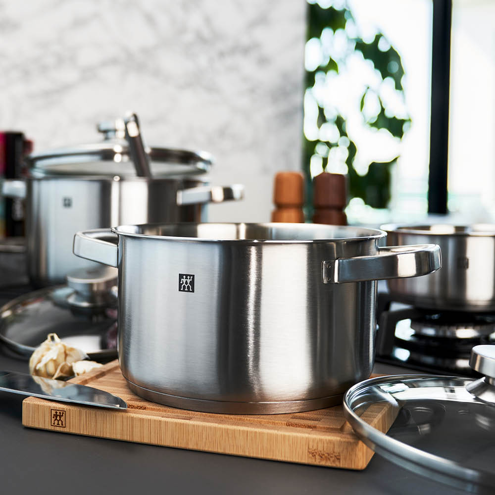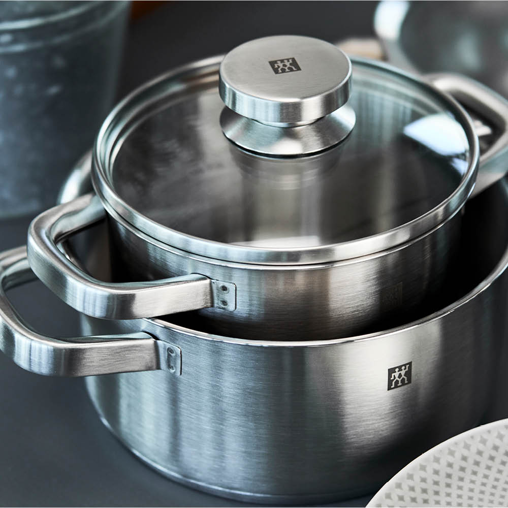 Det elegante kogegrejssæt Joy fra ZWILLING gør det endnu sjovere at lave mad. Sættet rummer alt fra 1,5 til 6 liter. Integreret påfyldningsskala til afmåling af væsker er en praktisk detalje. Det eksklusivt matterede, rustfri stål er af høj kvalitet og i den gennemprøvede kvalitet fra ZWILLING. Alle gryder er udstyret med en bund med en stærk kerne af aluminium og er beklædt med såkaldt sandwich-teknologi, der er meget robust. Det giver en fremragende varmeledningsevne, holder på varmen og sikrer en fremragende energieffektivitet. Egnet til alle komfurtyper, inklusive induktion. En praktisk detalje er de ergonomisk formede håndtag, der ikke bliver varme under madlavningen.