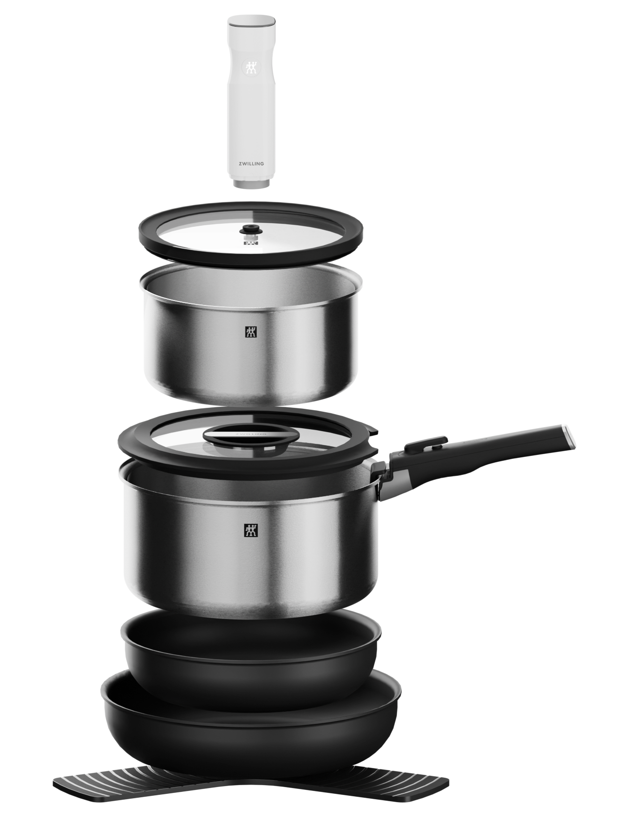 Udfold dit kulinariske potentiale med et innovativt alt-i-et-kogegrejssystem, der nemt forener tilberedning, madlavning, servering og vakuumpakning. Fra komfuret direkte på bordet og derefter i køleskabet – uden omhældning. Og ekstra holdbarhed med vakuum. Pander, gryder, skåle og tilbehør kan stables og er udstyret med aftagelige håndtag – maksimal funktionalitet på minimal plads. På den måde kan du lave mad på en pladsbesparende måde og med maksimal effektivitet.