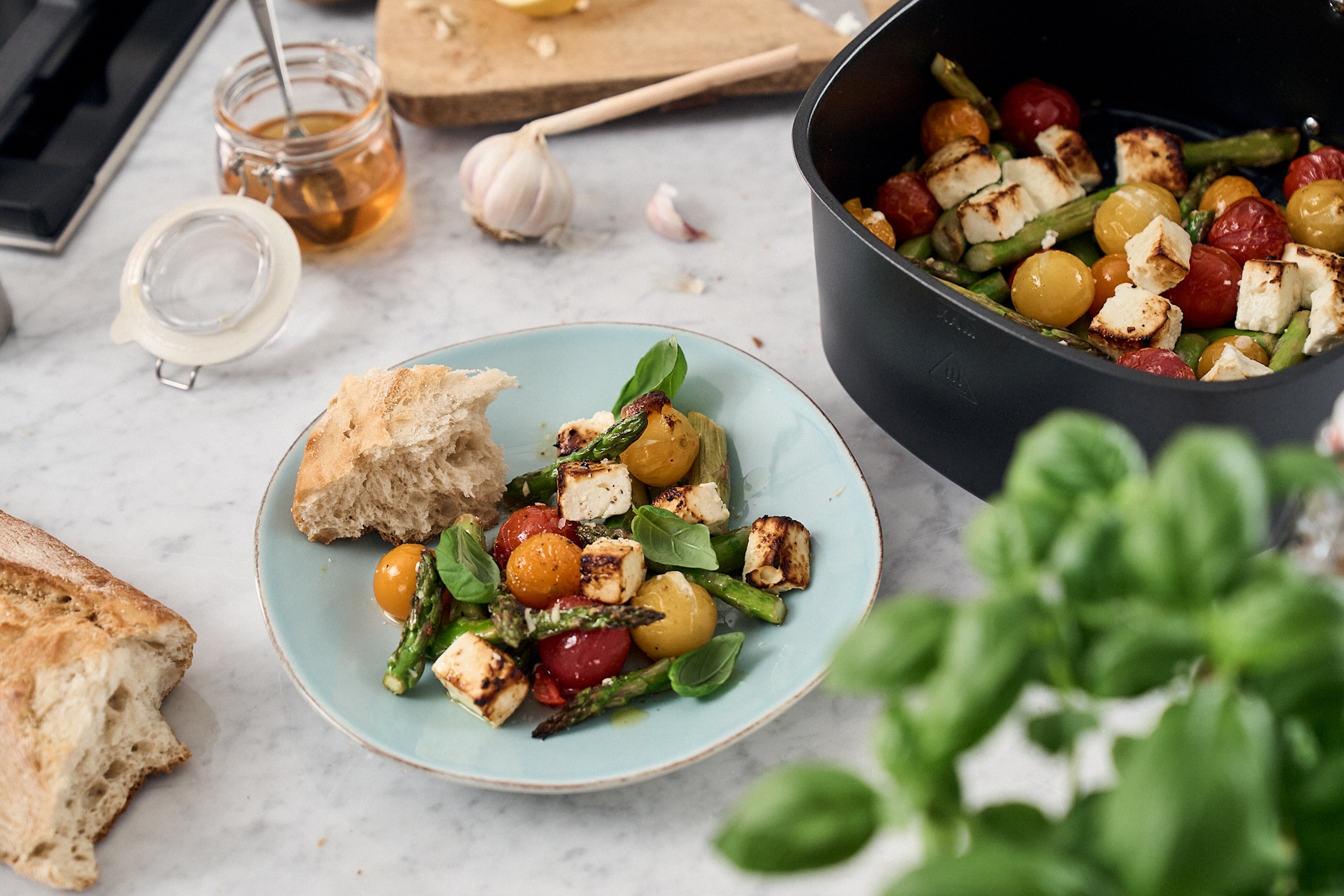 - Disponer las rodajas de tomate una al lado de la otra en la rejilla de la freidora de aire ZWILLING para que no se superpongan. Hornear a 200 °C durante aproximadamente 8-12 minutos, dependiendo del grosor de las rodajas, hasta que estén crujientes.