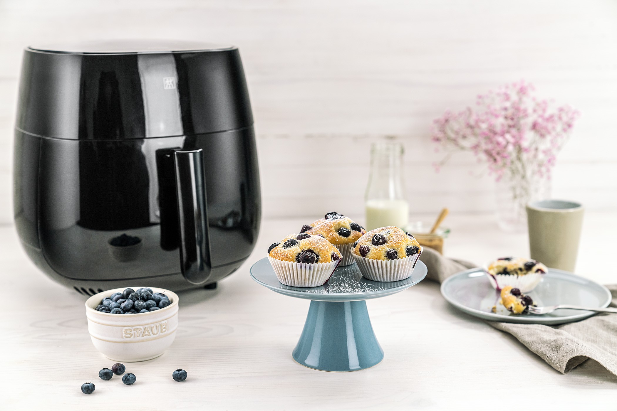 Colocar las brochetas en la freidora y freir en el programa “Aves de corral” (200 °C) durante aprox. de 10 a 12 minutos, dependiendo de qué tan doradas quieras que estén. Luego sacar y servir de inmediato. Servir con antipasti de verduras y baguette.