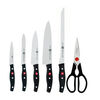 Un set de cuchillos de alta calidad y precisión, compuesto por 5 cuchillos de cocina y unas prácticas tijeras multiusos. El juego de cuchillos está compuesto por una puntilla, un cuchillo universal, un cuchillo fileteador, un cebollero y un jamonero.