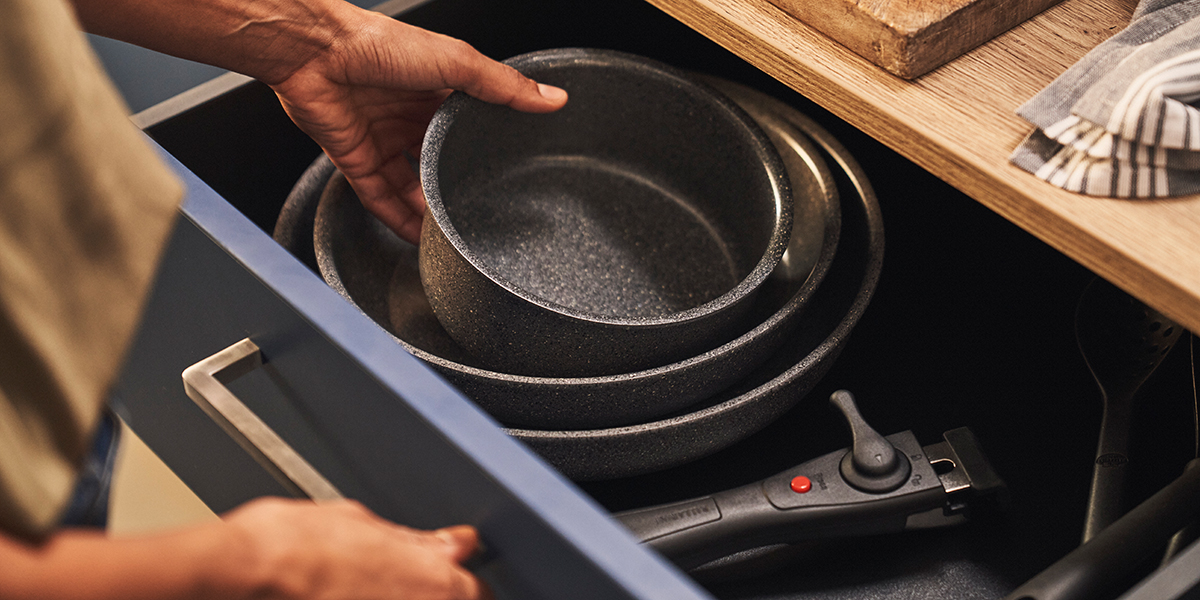 Même la plus petite des cuisines peut devenir l’antichambre de la cucina italiana grâce à BALLARINI Torre ! Cette gamme nouvelle génération dispose d’une poignée amovible afin de faciliter le rangement de vos batteries de cuisine BALLARINI. La poignée se clipse et se déclipse d’un simple geste. Vous pouvez ainsi empiler et ranger facilement poêles et casseroles pour un maximum de gain de place.