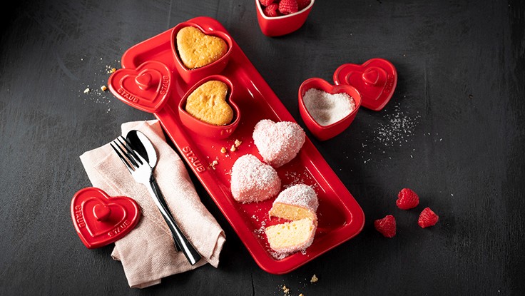 Battre les blancs d’œufs en neige avec une pincée de sel grâce au fouet ZWILLING PRO, puis ajouter délicatement le sucre. Incorporer les blancs en neige au mélange framboise-yaourt. Verser le tout dans 6 mini cocottes STAUB en forme de cœur et les mettre au congélateur pendant 4 heures.