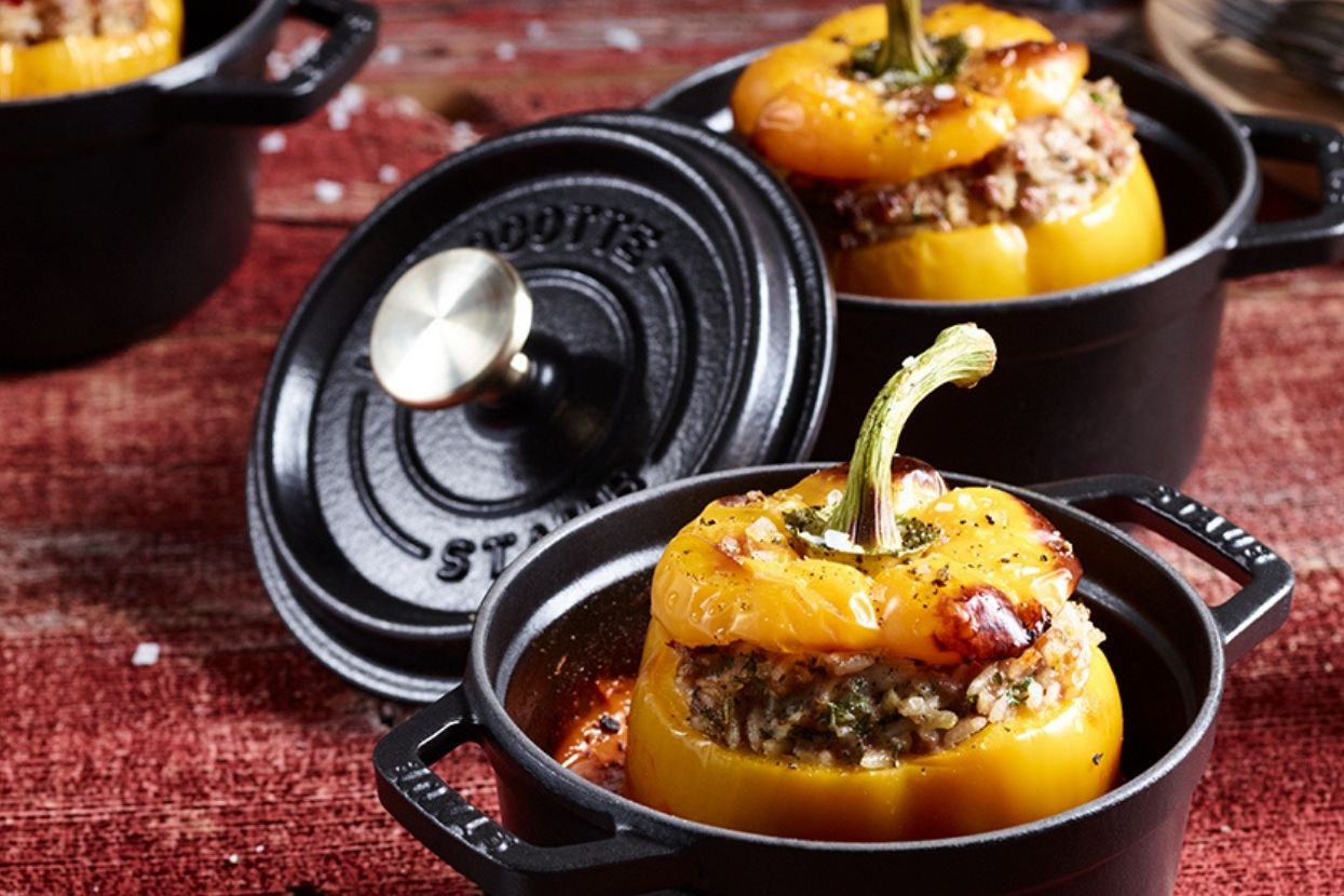 - Mélanger les pommes, les prunes, les mûres et le sucre puis mettre les fruits dans un plat à four STAUB.