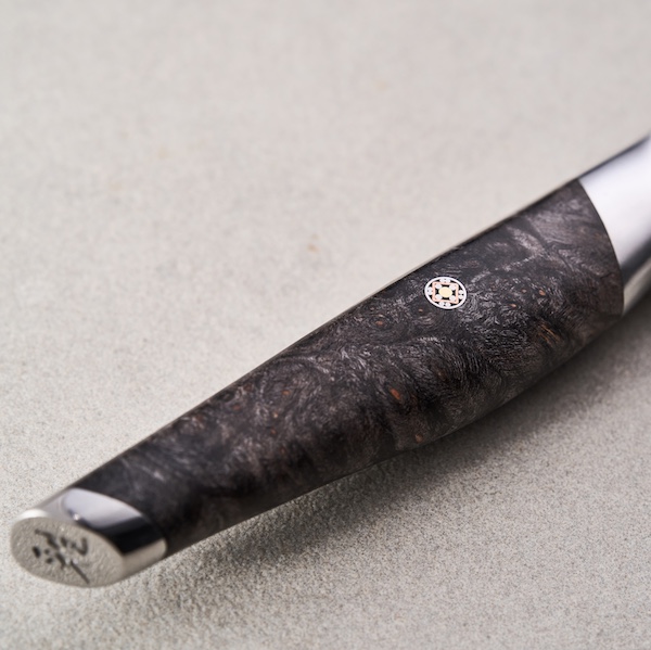 Manche élégant en érable foncé façonné à la main, dont la forme est parfaitement adaptée à la lame pour une maniabilité exceptionnelle.