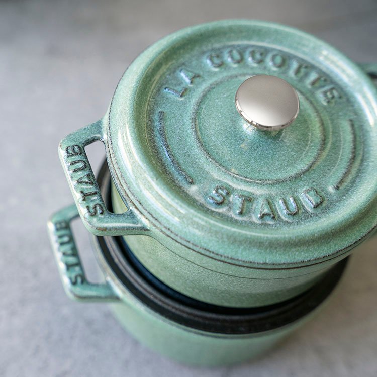 Appréciez-vous l'odeur des herbes fraîches et des légumes croquants, les effets apaisants de la nature et la sensation agréable de manger des aliments sains et savoureux ? Et si l’on vous disait que vous pouviez retrouver tout cela, joliment dressé, dans notre cocotte au tout nouveau coloris Sauge ? Le revêtement émaillé vert pastel s’accordera aussi bien avec une cuisine au style champêtre qu’une cuisine plus moderne tout en y apportant une touche de fraîcheur. Cette mini cocotte, d’un diamètre de 10cm, est la plus petite de la gamme STAUB. Qu’il s’agisse de cuisiner un plat ou un dessert, sa contenance de 0,25 litre est idéale pour des portions individuelles. La conception en fonte émaillée, matériau reconnu pour sa résistance, permet une cuisson homogène pour des résultats inégalés ! Grâce à ses propriétés uniques de rétention de la chaleur, les aliments restent à la température désirée pendant très longtemps, idéal pour servir le plat directement à table. Avec sa couleur vert clair, la cocotte Sauge égaiera votre table de fête sans détourner l'attention de la véritable star de la soirée : votre plat !