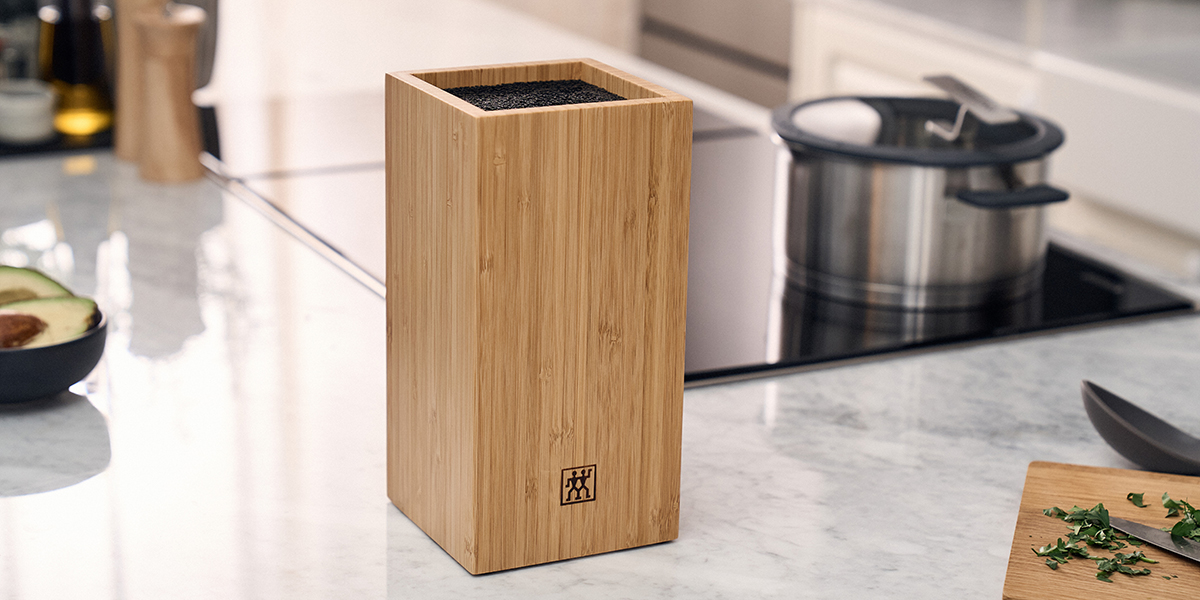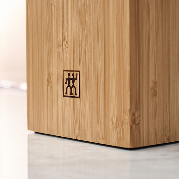 Un seul bloc pour tous vos couteaux : le bloc de couteaux flexible de ZWILLING. Pas de fentes préfabriquées pour des couteaux en particulier. À la place, des poils souples en plastique. Vous pouvez ainsi ranger jusqu’à sept couteaux, comme bon vous semble. Indépendamment du type de couteau. Quelle que soit la taille : tous les couteaux jusqu’à 20 cm y trouvent leur place. Et vous choisissez où ranger quel couteau. De plus, les couteaux restent affûtés plus longtemps grâce à ce compartiment adapté et prévu à cet effet. Pour plus d’hygiène, vous pouvez facilement retirer l’insert de poils et le nettoyer. Le bloc compact et peu encombrant est fabriqué en bambou certifié FSC® : une matière première renouvelable et un atout esthétique et moderne dans votre cuisine.