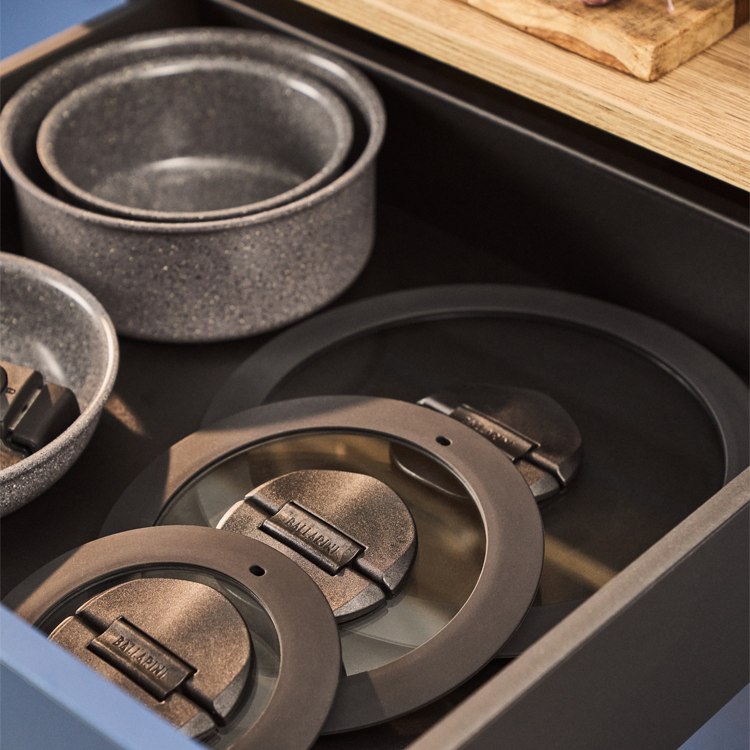 Anche le cucine più piccole possono diventare funzionali. Infatti, le pentole BALLARINI Torre, oltre alle alte performance di cottura, offrono molto di più. Basta un clic per rimuovere il manico e impilarle con facilità. Per mobili organizzati in cui regna l'ordine e quindi più spazio.