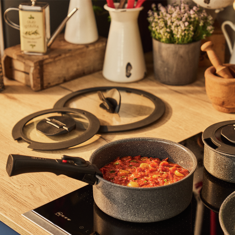 I coperchi in vetro a tenuta ermetica consentono una cottura a vista efficiente dal punto di vista energetico. Grazie all'incavo, puoi lasciare fissato il manico rimovibile durante la cottura.