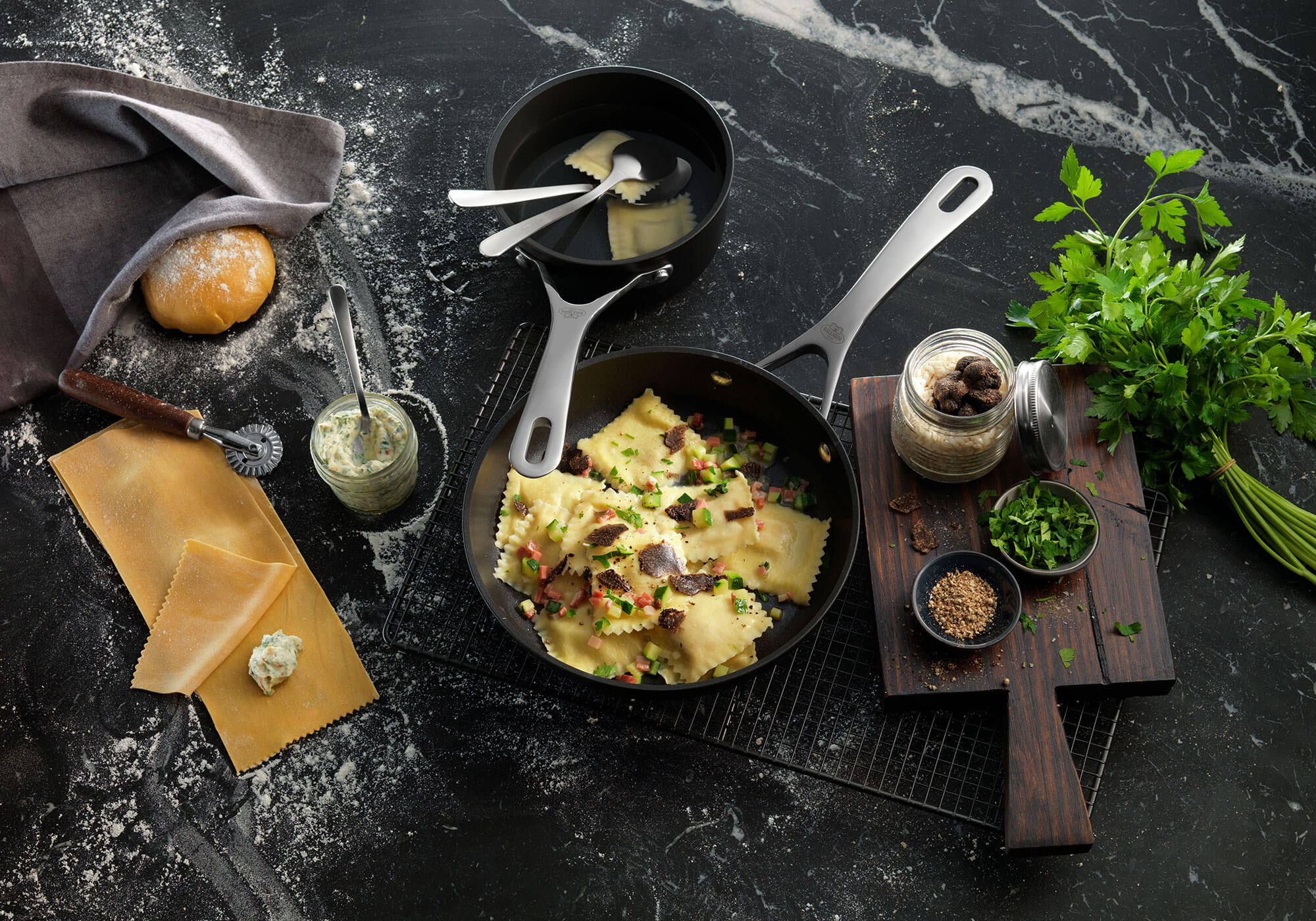 2. Scaldare il burro chiarificato in una padella, scottare entrambi i lati della carne e toglierla. Rosolare le verdure nella stessa padella per 4-5 minuti. Aggiungere l'aglio e il concentrato di pomodoro e rosolare allo stesso modo. Deglassare con il vino rosso, lasciare ridurre per 3-4 minuti e aggiungere i pomodori pelati. Aggiungere il timo e il rosmarino. Preriscaldare il forno a 180°C.