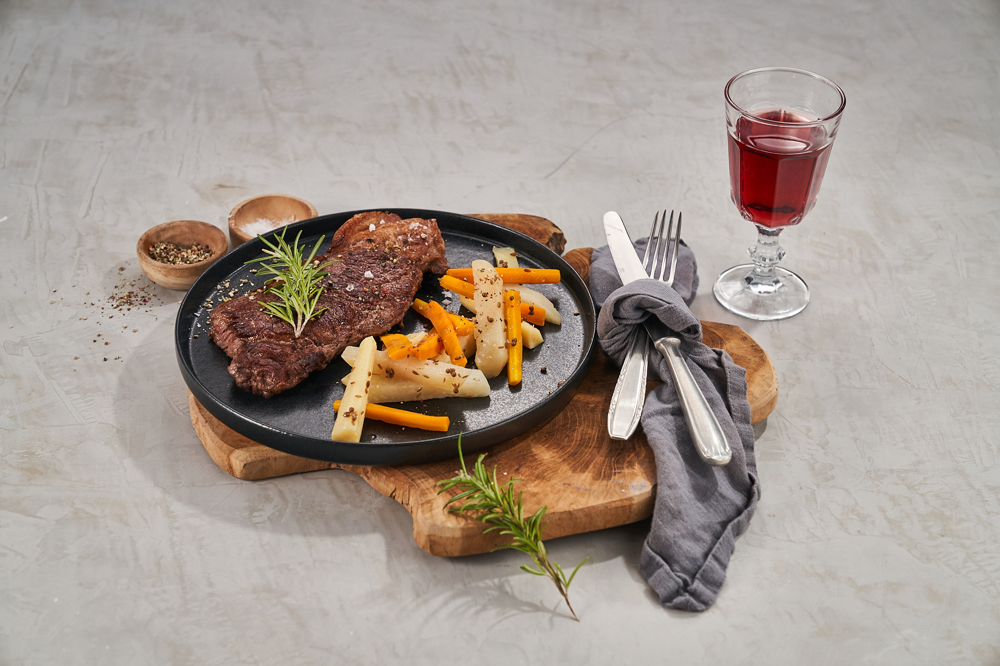Lavare e asciugare il filetto di manzo. Lavare e asciugare i rametti di rosmarino. Inserire il filetto, 2 rametti di rosmarino e metà dell’olio d’oliva in un sacchetto per sottovuoto, come quelli ZWILLING FRESH & SAVE, e sigillare sottovuoto. Agganciare lo stick per cottura a bassa temperatura ZWILLING ENFINIGY a una pentola di dimensioni adeguate e, se necessario, inserire nella pentola anche la griglia per cottura sous-vide. Versare l’acqua, facendo attenzione alla quantità massima richiesta dallo stick, e riscaldare l’acqua fino a raggiungere 56 °C. Immergere il sacchetto e lasciare cuocere il filetto a bassa temperatura per 1 ora.