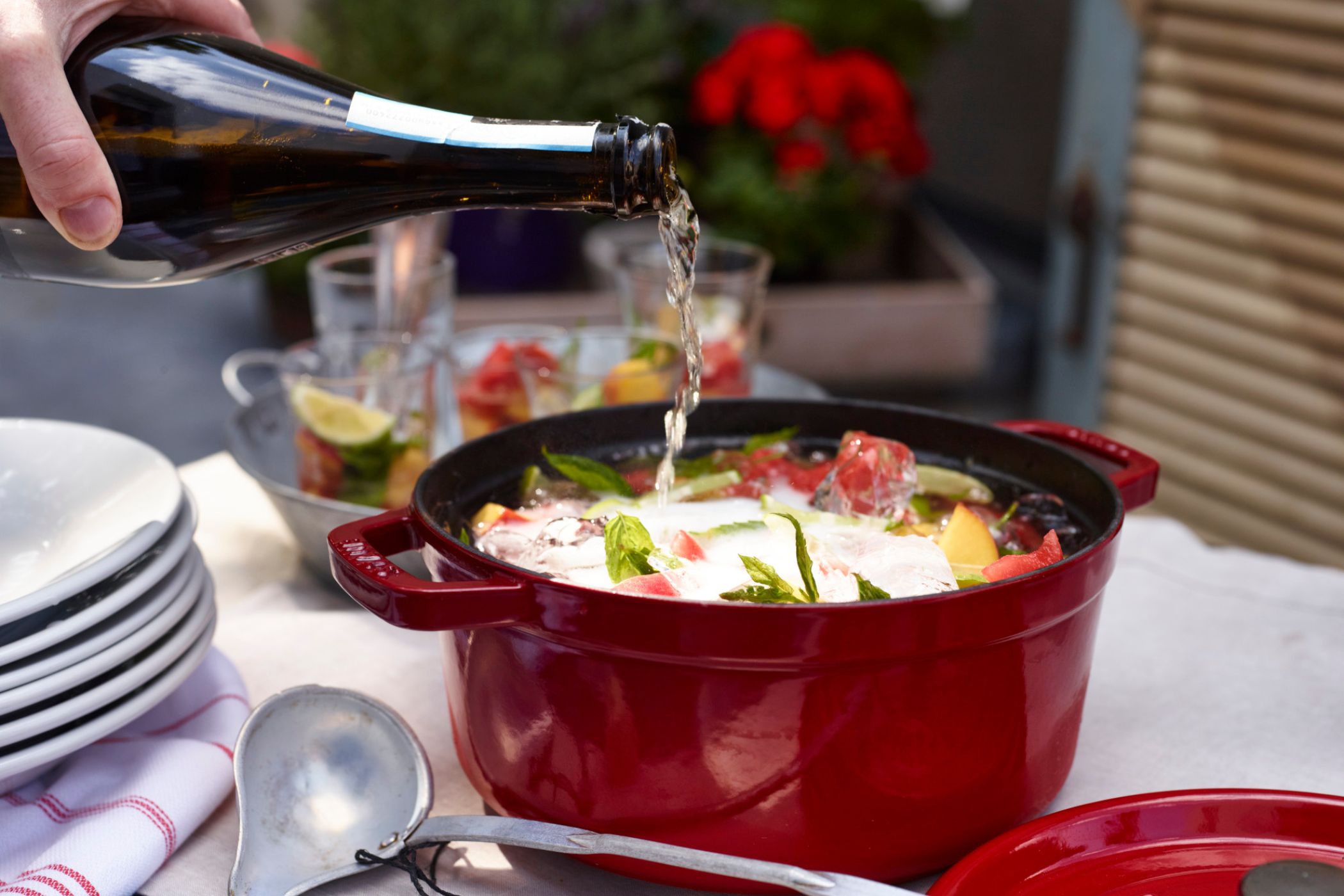 - Dividere a metà il frutto della passione; raschiarne la polpa con un cucchiaio. Unire in una cocotte la polpa (compresi i semi), lo zucchero per marmellata, i semi di vaniglia e le pesche a cubetti.