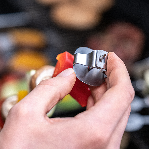 Per evitare che i gustosi ingredienti scivolino dagli spedini durante la cottura sulla griglia, gli spiedini presentano una forma piatta che assicura una presa migliore, completata da un inserto che mantiene il cibo saldamente.