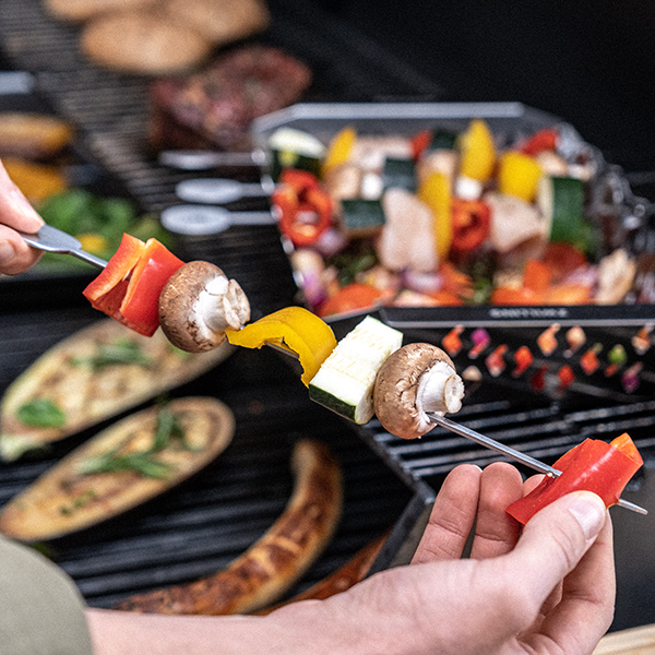 Gli spiedini da barbecue si adattano perfettamente alla pirofila da barbecue ZWILLING BBQ+ M. In questo modo gli spiedini acquistano il loro delizioso sapore di griglia senza entrare in contatto diretto con la fiamma o la brace.