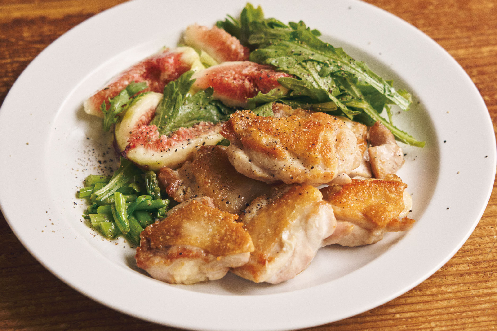 - 中火に熱したフライパンにオリーブオイルを入れ、鶏もも肉の皮目を下に広げてフライパンに入れる。アルミホイルを被せ、弱火で14分焼く。様子を見ながら、皮を少しお箸で焼きつけ、まんべんなく焼き目をつける。裏返して、さらに5分焼く。