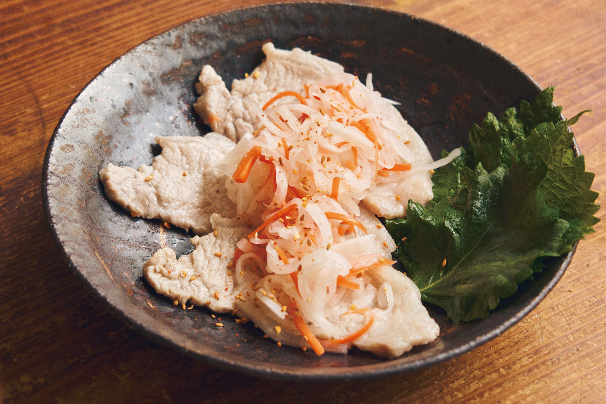 - 鶏もも肉を焼いている間に薄切りにした赤玉ねぎを寿司酢と混ぜる。