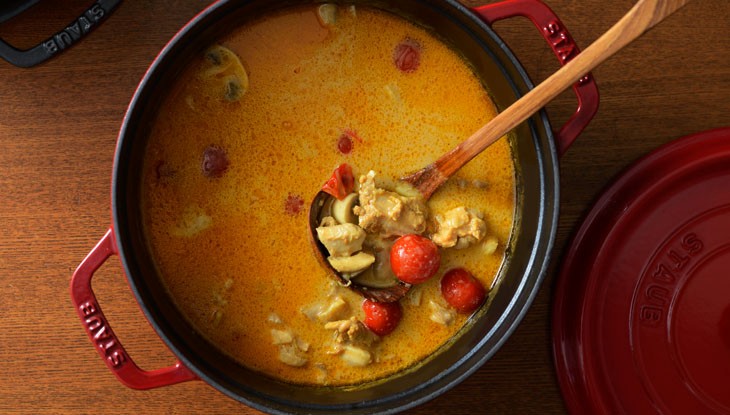 ストウブで作る「骨付き鶏と野菜のスープカレー」