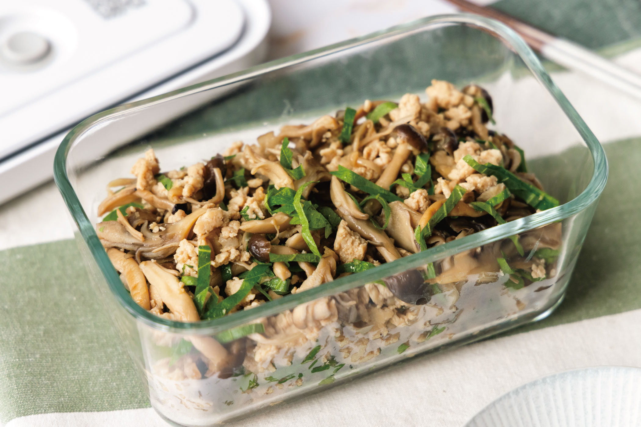 - 真空保存ボウルMにみりんを⼊れ、電⼦レンジ(600w)で40秒加熱する。えのきとしょうゆ、砂糖を加え、ふんわりとラップをかけて電⼦レンジで2分加熱する。