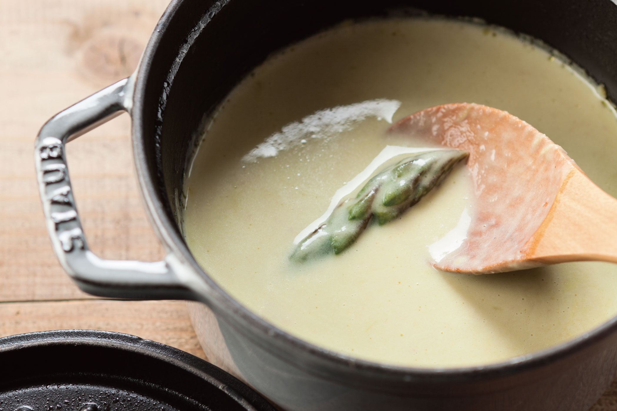 - 中火強で一度沸かし、アクを取る。蓋をして、隙間から蒸気が出てきたら弱火にして、野菜が柔らかくなるまで煮る(30分程度)。