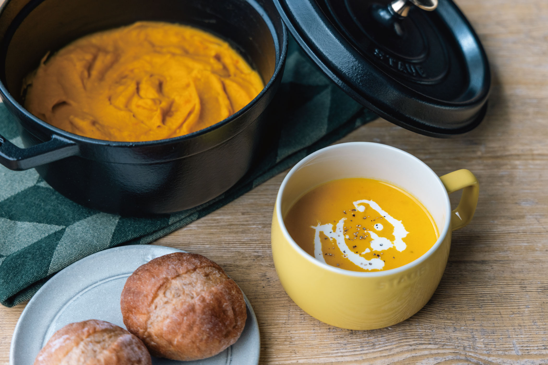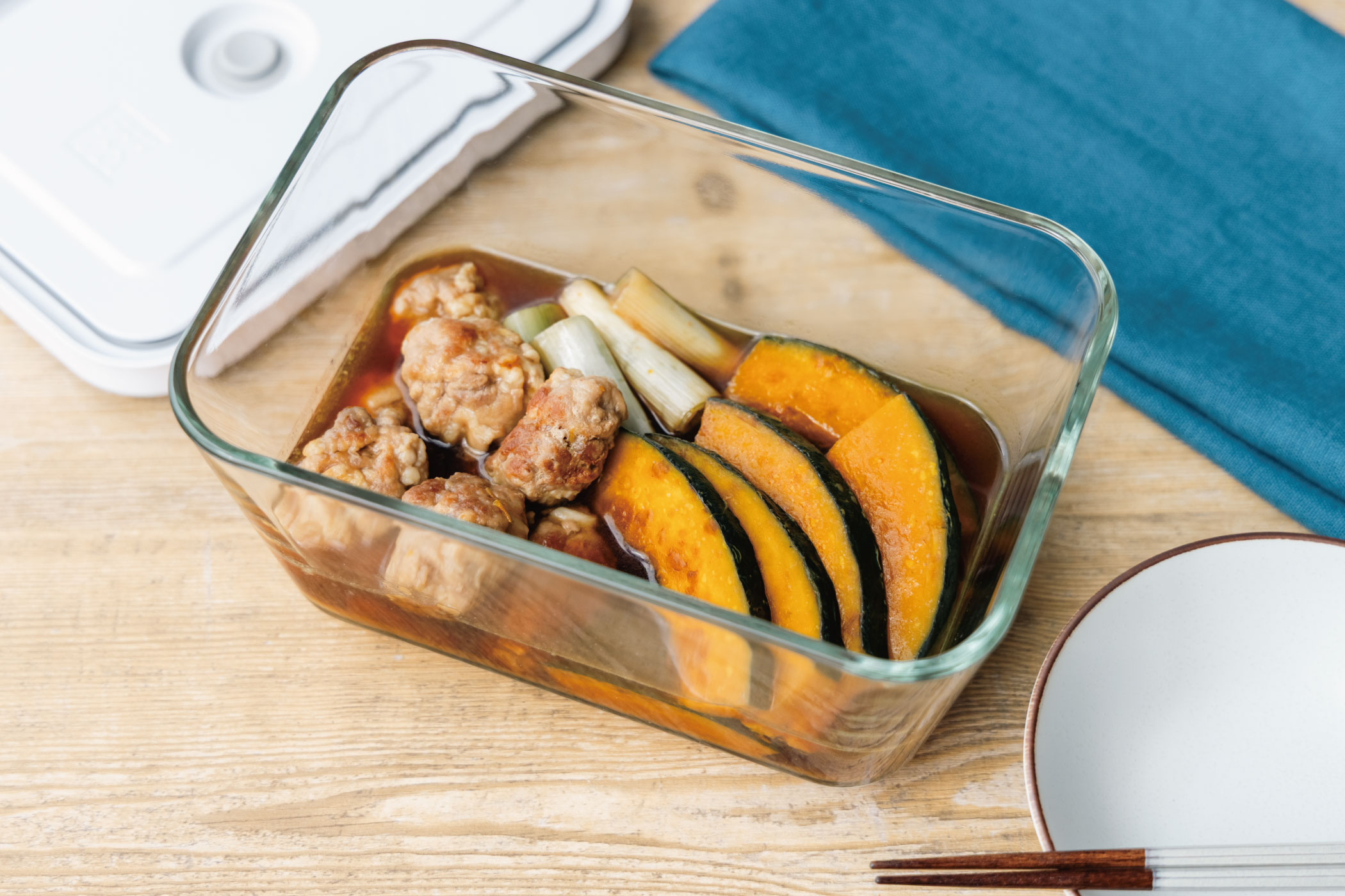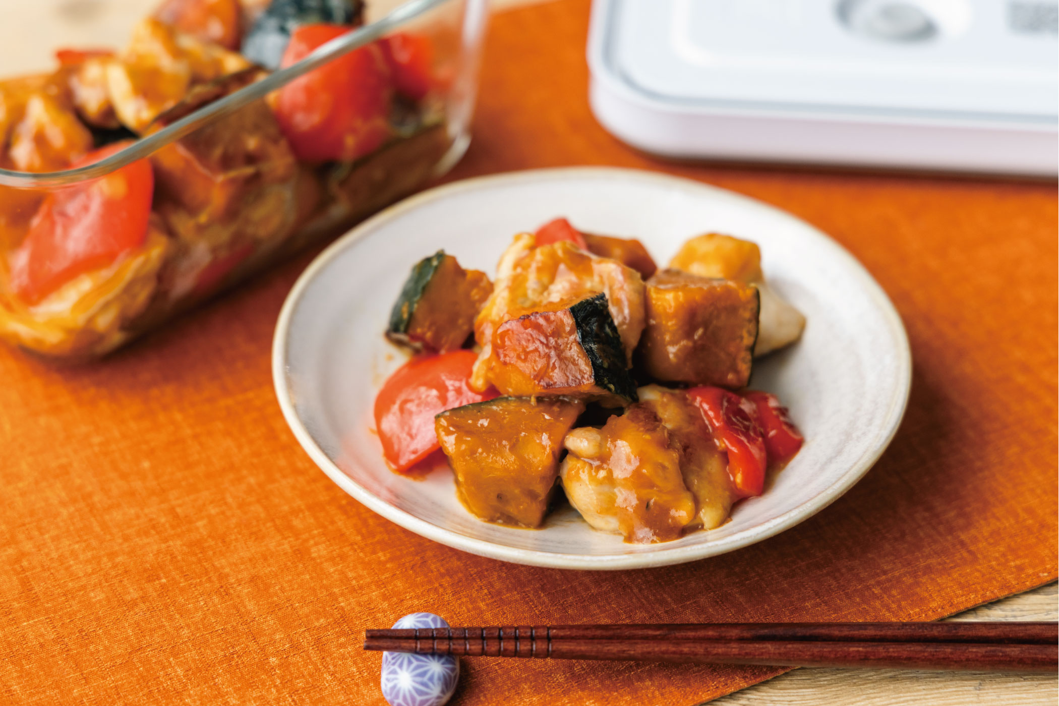 - かぼちゃは3、4cm⾓に切り、ガラスコンテナに⼊れる。ラップをかけ、電⼦レンジ(600w)で4分加熱する。