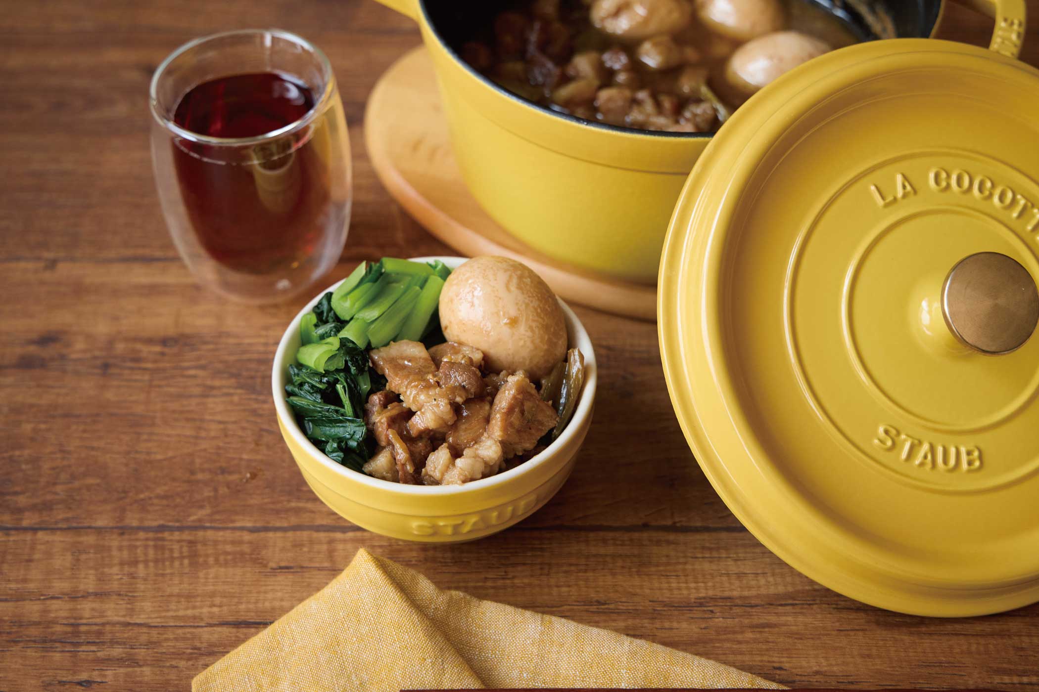 注意点 : 湯気が熱いため、必ずミトンを着用してからスチーマーインサートをココットの上にのせるようにしてください。 - 卵は取り出して冷水で冷やし、鶏肉はそのまま蓋をして5分ほどおいて余熱で火を通す。キッチンバサミで1㎝幅にカットして、卵を添えて完成。