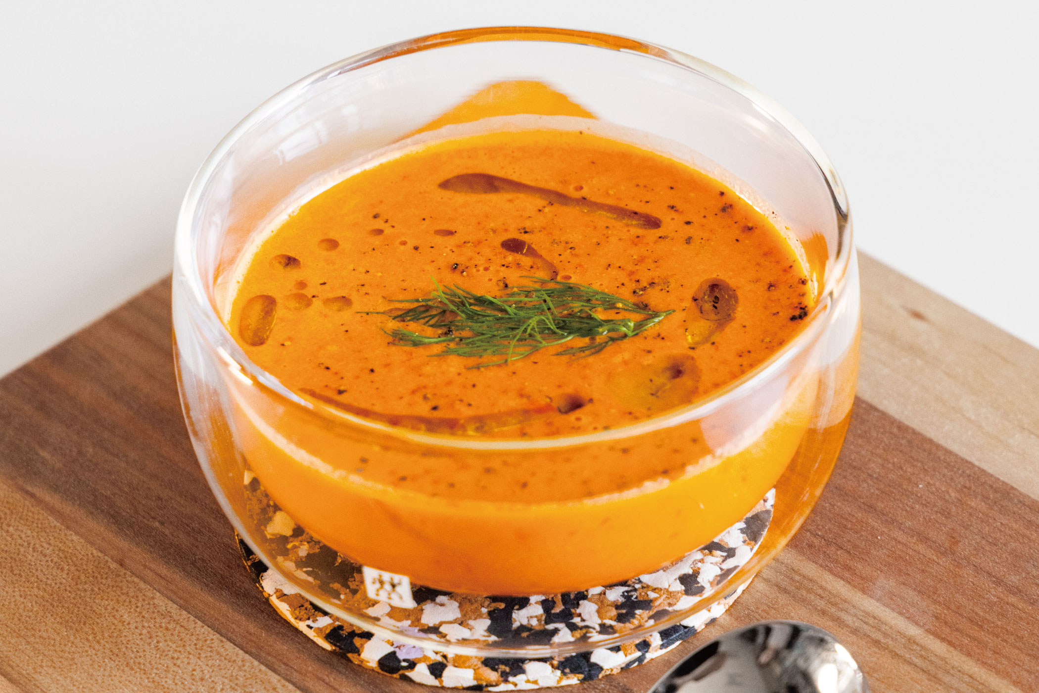 - グラスに注いだら、お好みのハーブとエキストラバージンオイルをトッピングして完成。