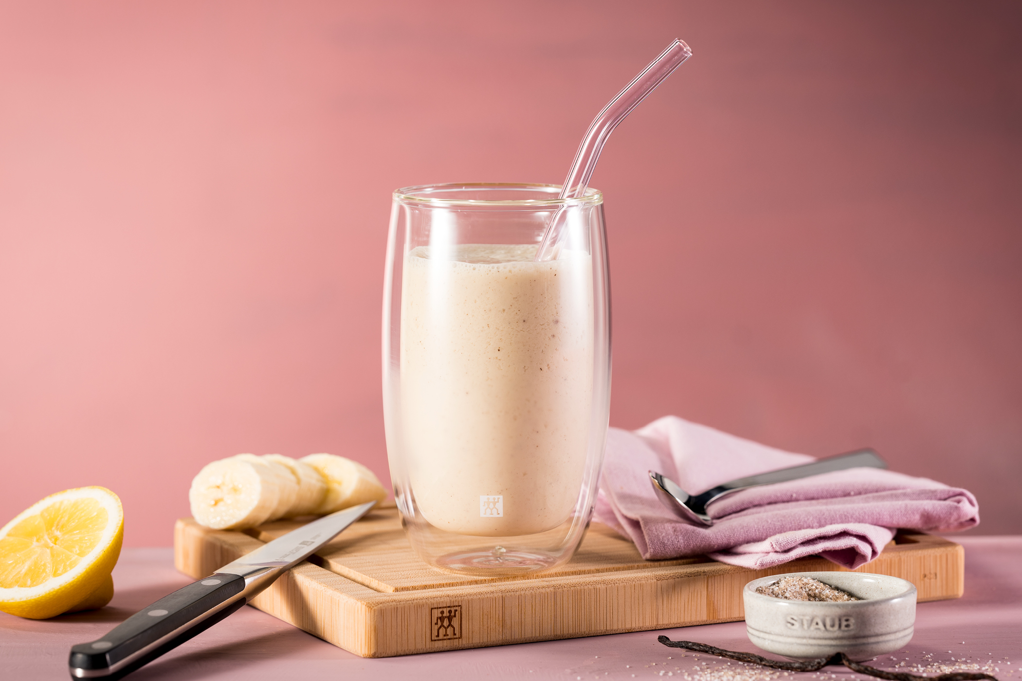 - ブレンドが終わったら蓋を外し、卵白を加えて再び蓋を閉めます。「カクテル」プログラムを選択し、ボタンを押してミキシングを開始します。(パーソナルブレンダーではプログラム「スムージー」を選択)