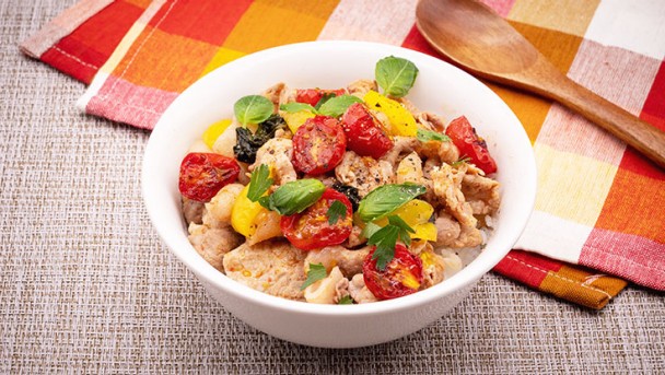 - 器にジャスミンライスとともに盛り付け、半熟の目玉焼きをのせる。お好みでパクチーとライムを添える。