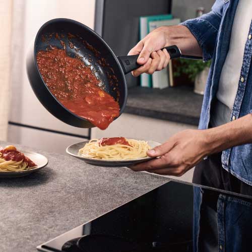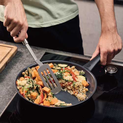 ツヴィリング独自の「セラフォース・チタニウム・コーティング」は、遠赤外線効果*1により食材の表面を焼き上げ、5.5mmの底厚設計が熱を蓄えながら均一に広げることで、外側は香ばしくパリッと、内側はふっくらと仕上げます。