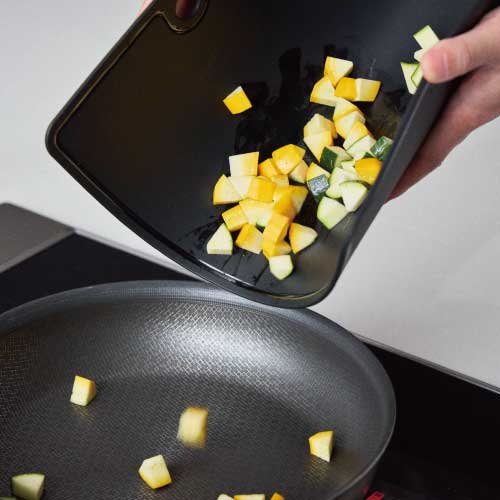 薄さと高い柔軟性を活かし、カットした食材をこぼす事なくそのまま鍋・フライパンへ移す事が可能です。